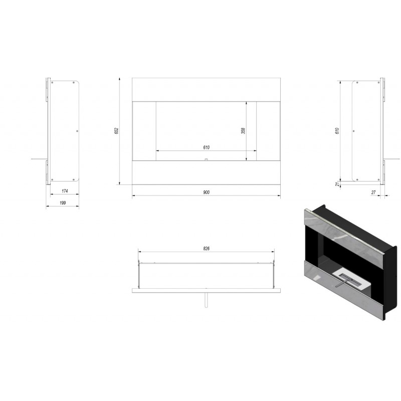 - indywidualna zabudowa: można zamontować we wnęce lub na specjalnie zbudowanym do tego celu elemencie dekoracyjnym wystającym ze ściany. Dylatacja: bezpieczna odległość od ściany (1,5 cm) pozwala na obieg powietrza wokół biokominka, bez dodatkowych listew montażowych.