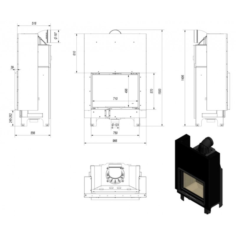 Wkład bezrusztowy - dopalanie na popiele, co oznacza, że opał wypala się na drobny popiół, którego pozostaje minimalna ilość. Uzyskana w ten sposób energia cieplna z drewna zostaje maksymalnie wykorzystana. Płyta dolna wkładu znacznie obniżona w stosunku do drzwi.