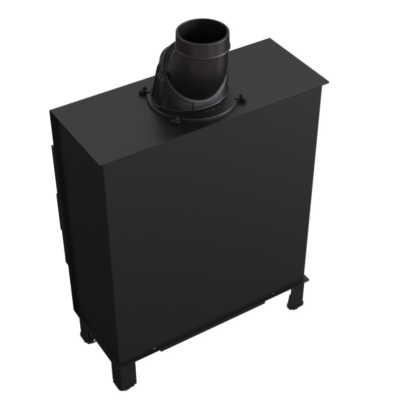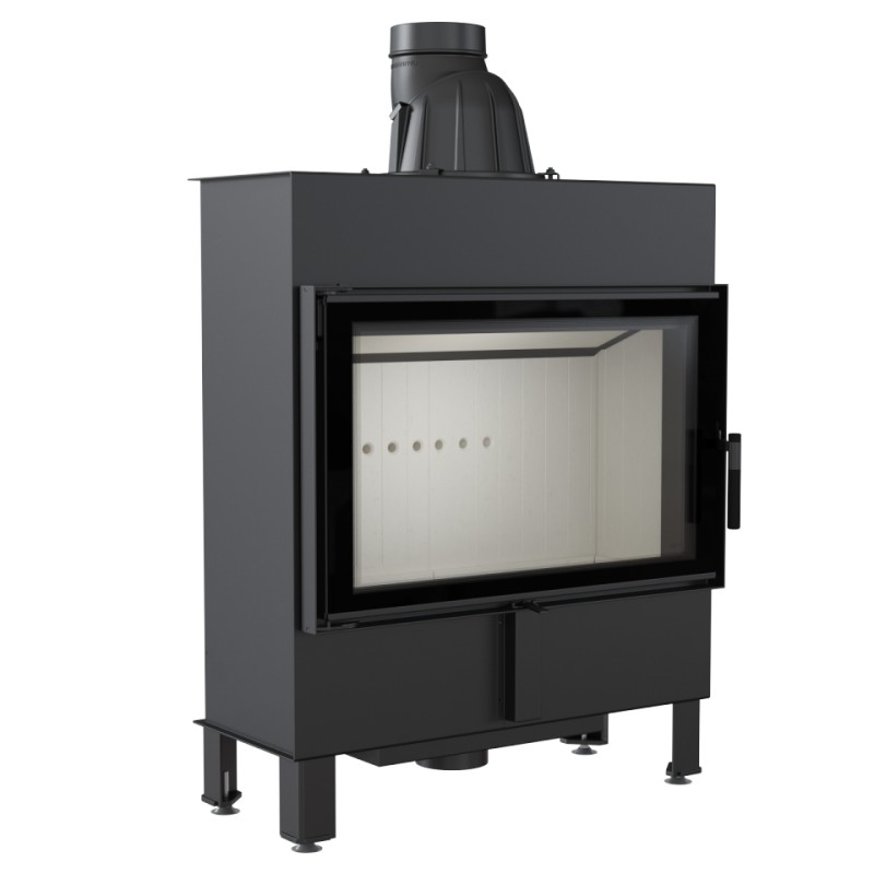 W kominku zastosowano specjalnie profilowaną płytę dolną wykonaną z Acumotte, dzięki czemu komora spalania jest głębsza i mieści większą ilość drewna. Jednocześnie zastosowano skróconą komorę paleniska, co wpływa na mniejszą moc wkładu. Dzięki temu doskonale sprawdzi się on w salonach o niewielkich gabarytach.