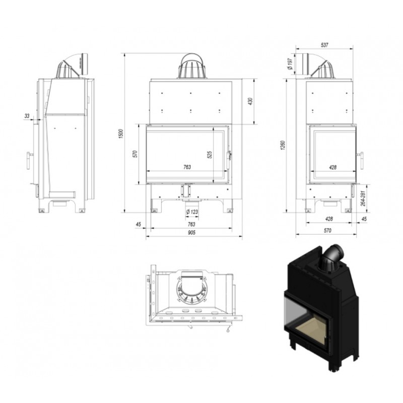 Wkład bezrusztowy - dopalanie na popiele, co oznacza, że opał wypala się na drobny popiół, którego pozostaje minimalna ilość. Uzyskana w ten sposób energia cieplna z drewna zostaje maksymalnie wykorzystana. Płyta dolna wkładu znacznie obniżona w stosunku do drzwi.
