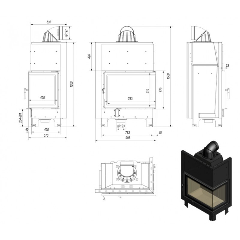 Wkład bezrusztowy - dopalanie na popiele, co oznacza, że opał wypala się na drobny popiół, którego pozostaje minimalna ilość. Uzyskana w ten sposób energia cieplna z drewna zostaje maksymalnie wykorzystana. Płyta dolna wkładu znacznie obniżona w stosunku do drzwi.