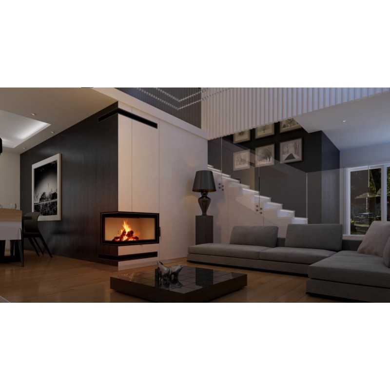 Dekoracyjna szyba typu glass wytrzymująca temperaturę do 800°C, która nadaje kominkowi nowoczesny i elegancki wygląd, optycznie powiększa front wkładu.