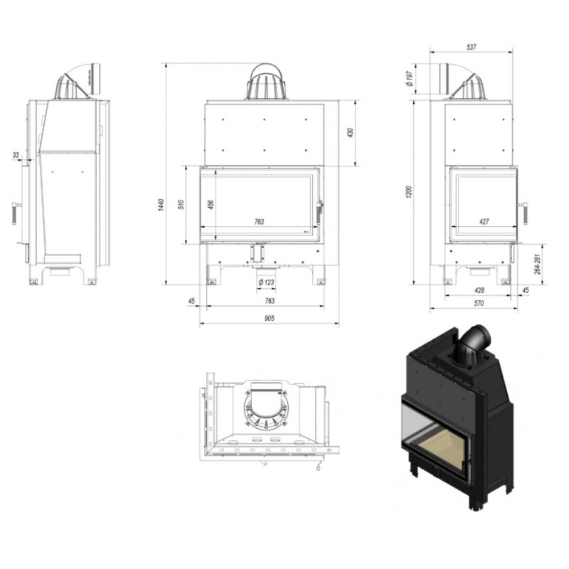 Potrójny system dopowietrzenia komory spalania: powietrze pierwotne - skierowane jest na płytę, na której odbywa się spalanie; powietrze wtórne dostarczane jest otworami w tylnej ścianie. Dodatkowo we wkładzie zastosowany jest system czystej szyby (kurtyna powietrza).