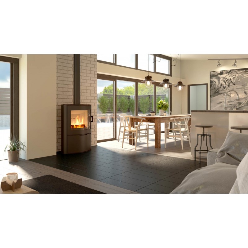 Uwydatnione piękno ognia dzięki zaokrąglonej szybie.
