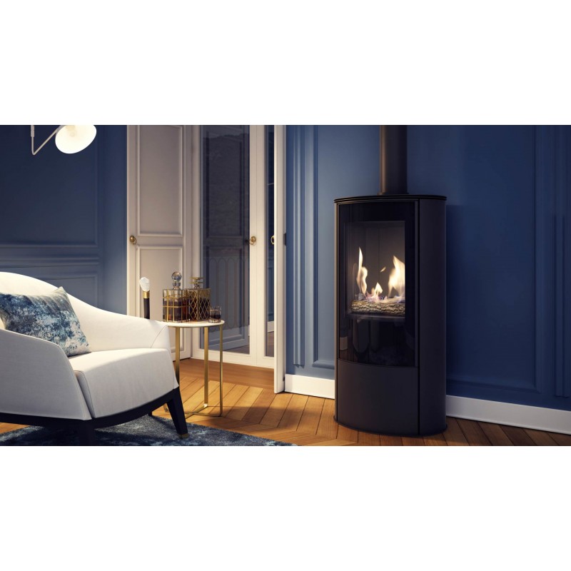 Całkowita kontrola i regulacja urządzenia odbywa się przy użyciu pilota z wbudowanym termostatem. Instalacja nie wymaga tradycyjnego komina - system przewodów koncentrycznych umożliwia montaż kozy w pomieszczeniach bez komina, wystarczy wyprowadzić przewód poza ścianę budynku lub dach.