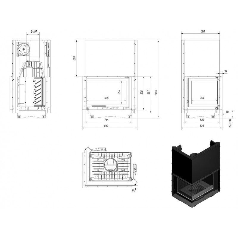 Wkład kominkowy z dwoma szybami zestawionymi ze sobą pod kątem prostym (szyby łączone bez szprosa).