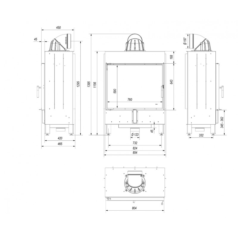 Potrójny system dopowietrzenia komory spalania: powietrze pierwotne - doprowadzone pod ruszt; powietrze wtórne dostarczane jest otworami w tylnej ścianie. Dodatkowo we wkładzie zastosowany jest system czystej szyby (kurtyna powietrza).
